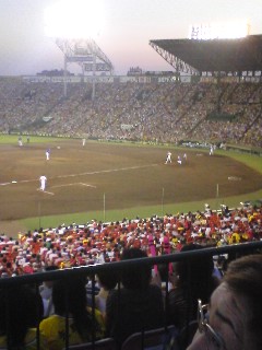 それにしても全く何にも知らずに手ぶらで行ったのですけれど、隣のおばちゃま2人がとっても良い方々で、手ぶらの私達に応援でカンカン鳴らすピンクや黄色のバットをかたどった応援グッズ(あれ、何ていうのん???)を1人ずつ貸して下さった上、7回裏で飛ばす恒例の風船も、勝った後に飛ばす風船も、「あんたら、何も持ってきてへんのかいな~、しゃぁないな。これな、トラッキーのマーク付いてるから高いねんけど…あげるからな!飛ばしぃや!」と言って1つずつ下さって(計4つも!)、えせファンなりきって、いい感じで楽しませてもらえたのですー。